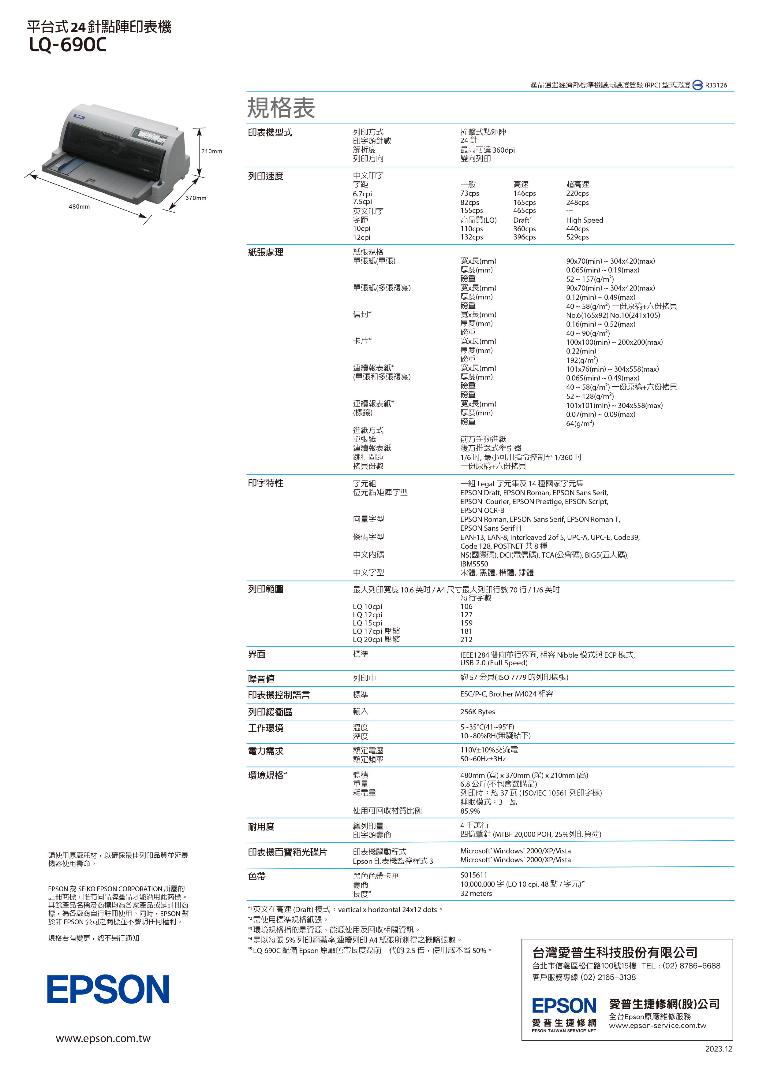 印字頭壽命4億擊針,總列印量4000萬行