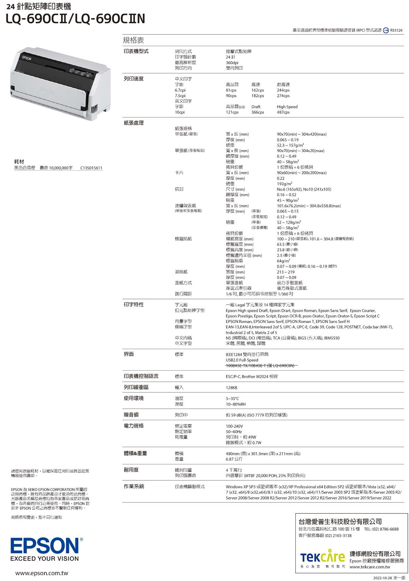 LQ-690CII/ LQ-690CIIN、體積輕巧、耗電量低,適合銀行、飯店、旅行業、運輸業、診所等櫃檯業務、或企業財務、倉庫管理等行業使用,滿足多樣化單據或ㄧ式多份文件的列印需求,大幅提升業務效率與客戶滿意度!